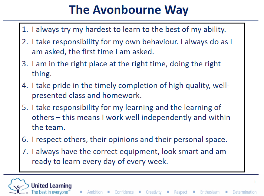We treat the Avonbourne Way as our behaviour curriculum and believe that it is as important as our academic curriculum. We expect our students to model these behaviours and attitudes, not only in the classroom, but also when in the corridors, playgrounds, sports fields and out in the wider community. We are passionate that our students should not only leave with excellent academic outcomes, but also the values and personal skills that will enable them to contribute to society and live happy fulfilling lives.